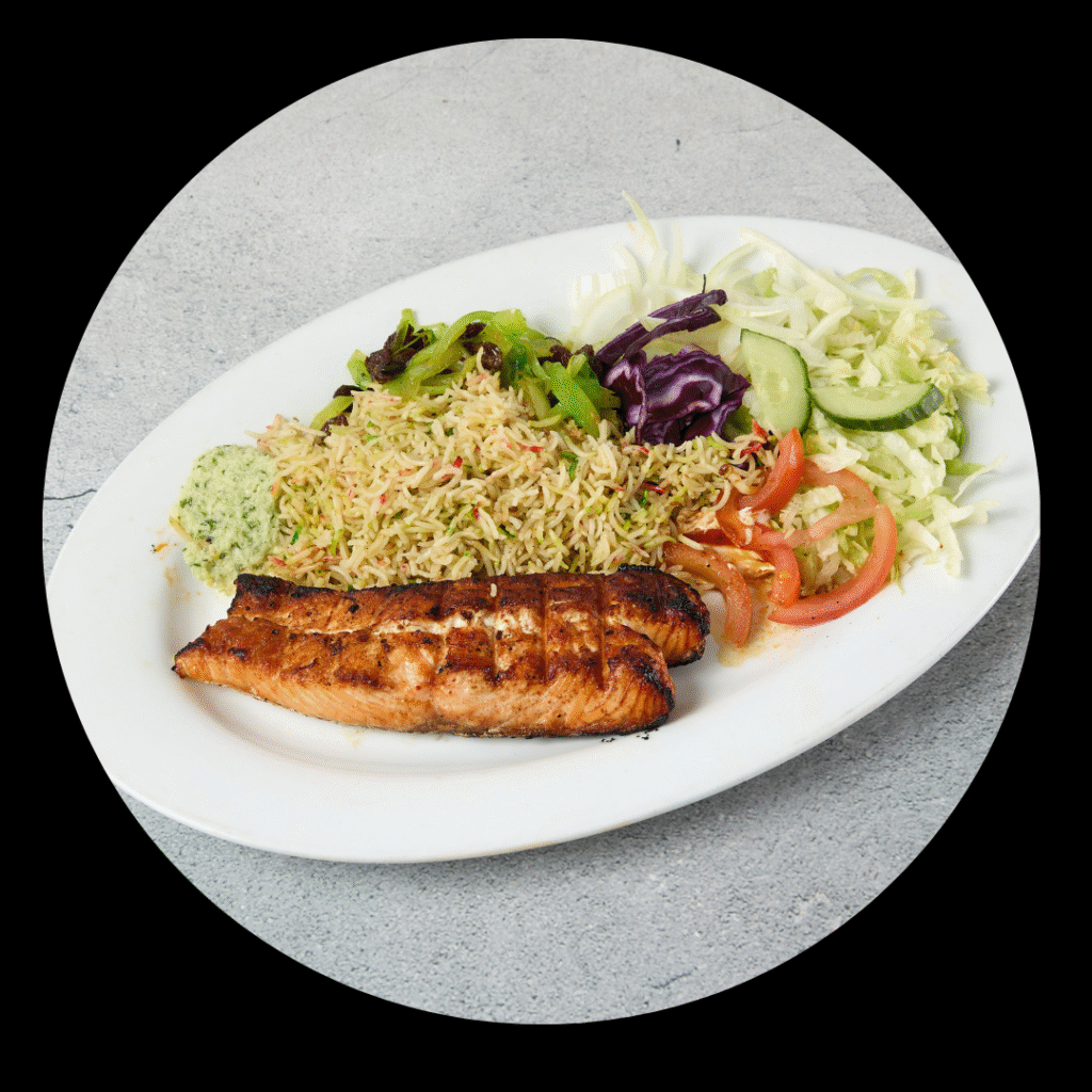 Perfectly seasonsed tender grilled salmon served with salad, rice, Spaghetti or flat Somali Bread sabbayad