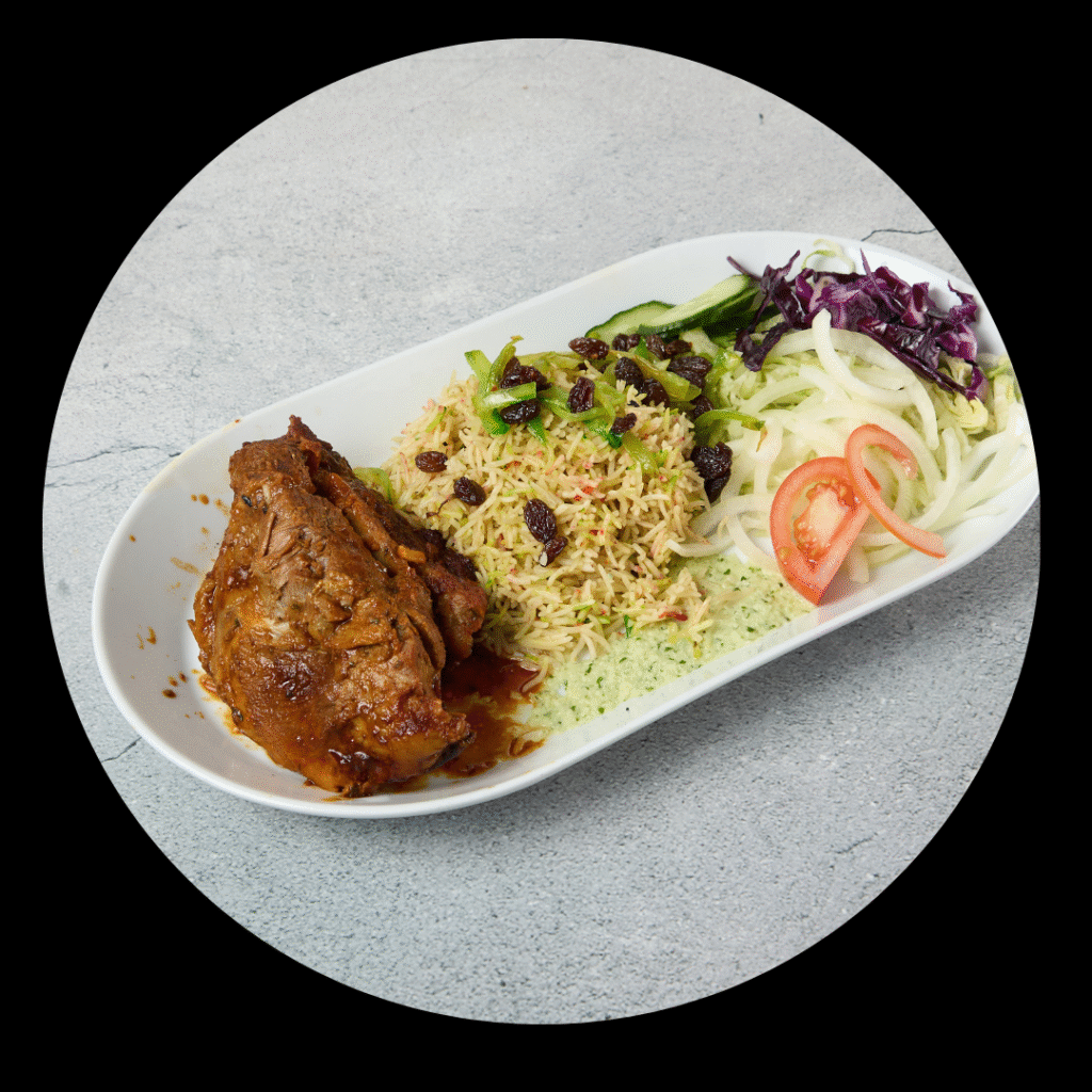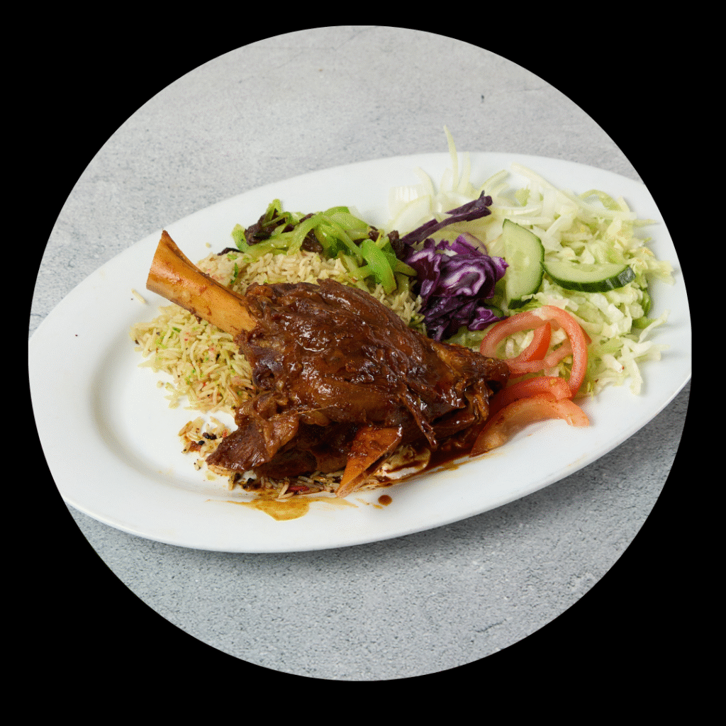 Perfectly marinated slowly cooked lamb shank comes with salad, rice, Spaghetti or flat Somali Bread sabbayad